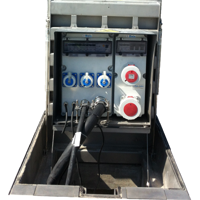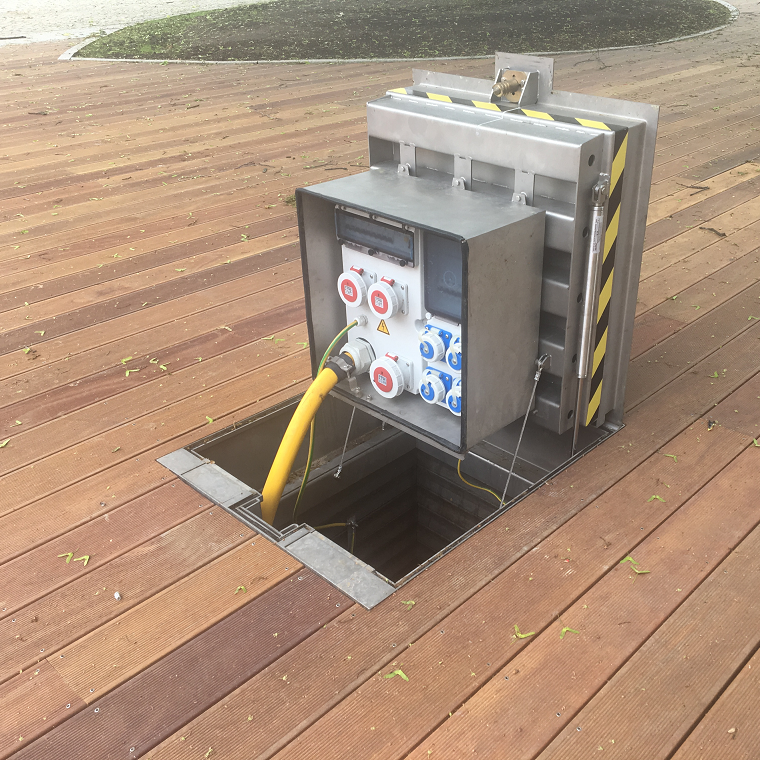 After the plug and socket device has been connected, the cable can be guided upwards and out through the cable outlet openings. The cover can then be lowered again so that it is flush with the ground. The modular system makes installation of the substructure extremely easy. The individual segments are placed on top of each other, according to the required depth of the distributor, and interlock. Concreting or bonding of the individual elements is not necessary.