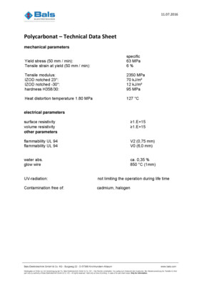 Polycarbonate possesses excellent impact strength, high heat resistance and good dimensional stability. It was one of the first thermoplastics to offer these properties. Although it is stable to water, mineral and organic acids, it is partially soluble in aromatic hydrocarbons, soluble in the chlorinated ones, and decomposes in strongly alkaline substances. It has good electrical properties.