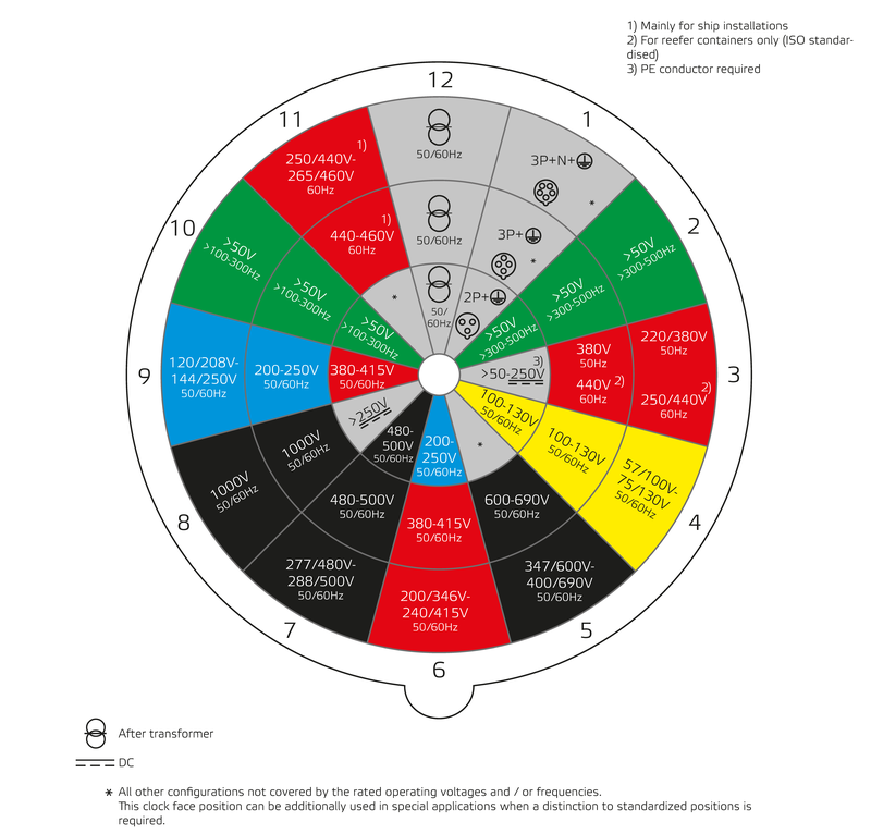 To ensure that a plug cannot be inserted into a socket with a different voltage or frequency, the positions of the protective contacts relative to the keyway of the socket collar have been assigned to certain voltages and frequencies. A groove in the connector collar and a corresponding lug on the plug prevent hazardous confusion between the systems.