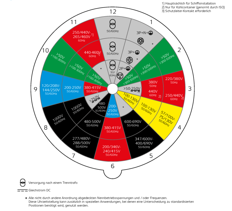 Damit ein Stecker nicht in eine Steckdose anderer Spannung oder Frequenz eingeführt werden kann, wurden Stellungen des Schutzkontaktes zur Unverwechselbarkeitsnut des Dosenkragens bestimmten Spannungen und Frequenzen zugeordnet. Durch eine Nut im Kupplungskragen und eine entsprechende Nase am Stecker ist eine gefahrbringende Verwechslung der Systeme nicht mehr möglich.