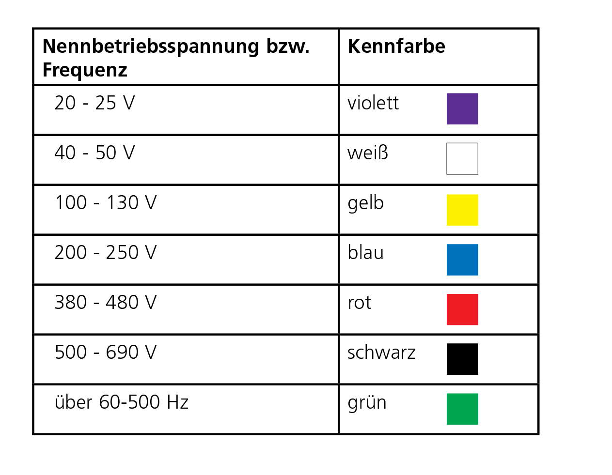 Wird die Betriebsspannung zusätzlich zu den vorgeschriebenen Aufschriften durch Kennfarben bezeichnet, dann sollte vorzugsweise der Farbcode der folgenden Tafel benutzt werden: