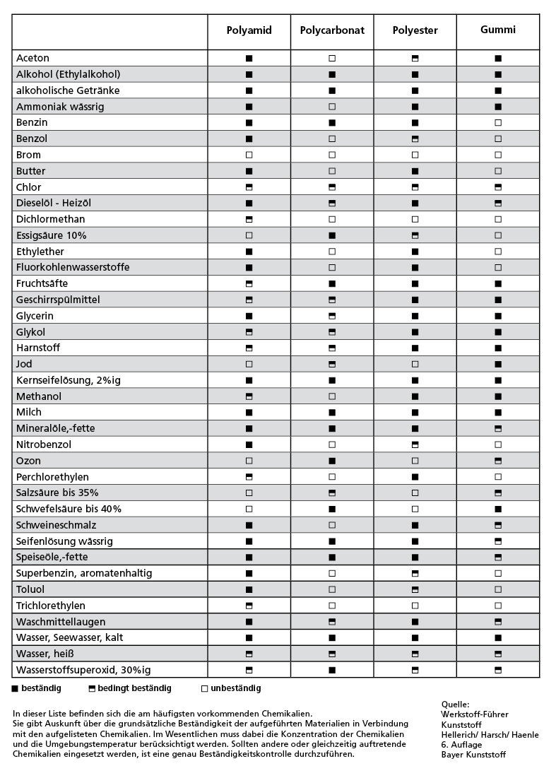 In dieser Liste befinden sich die am häufigsten vorkommenden Chemikalien. Sie gibt Auskunft über die grundsätzliche Beständigkeit der aufgeführten Materialien in Verbindung mit den aufgelisteten Chemikalien.