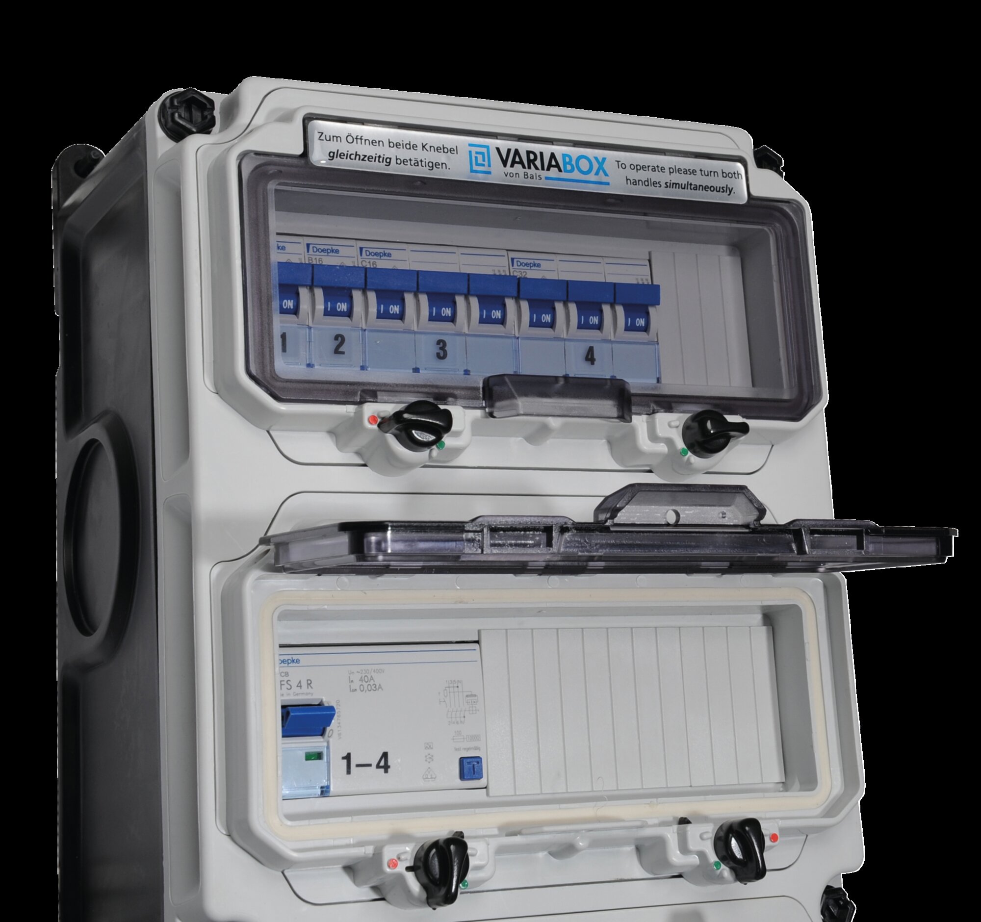 Patentierte Schließmechanik von Betätigungsklappen für die VARIABOX Verteilerreihe von Bals